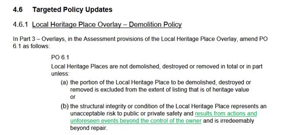 The changes approved on 19th December will give the Council Assessment Panel (CAP) the ability to consider the actions that are within the control the owner of a local heritage property, such as maintaining the condition of the building to prevent it falling into a state of irredeemable disrepair.
